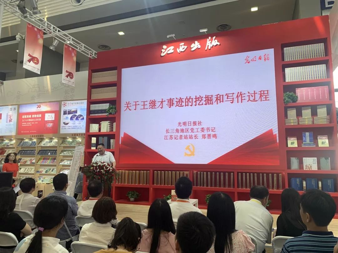 7月27日,江西高校出版社与光明日报出版社联合在书博会现场举办了“讴歌英雄 致敬祖国——《两个人的五星红旗——王继才与王仕花的守岛故事》”新闻发布会。中国出版协会副秘书长刘丽霞,江西省委宣传部副巡视员林大建,江西省委宣传部图书出版印刷发行处处长汪维国,中文传媒党委委员、总编辑游道勤,光明日报长三角地区党工委书记、江苏记者站站长、该书作者郑晋鸣,光明日报出版社社长潘剑凯,江西高校出版社总编辑肖俊南等出席发布会。