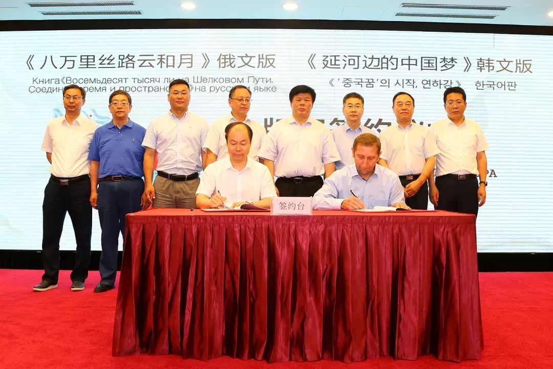 7月28日,陕西师范大学出版总社在西安举办《八万里丝路云和月》俄文版、《延河边的中国梦》韩文版版权输出签约仪式。